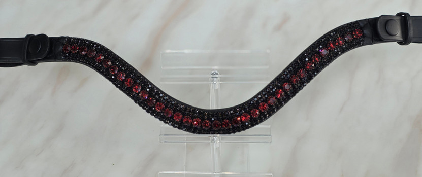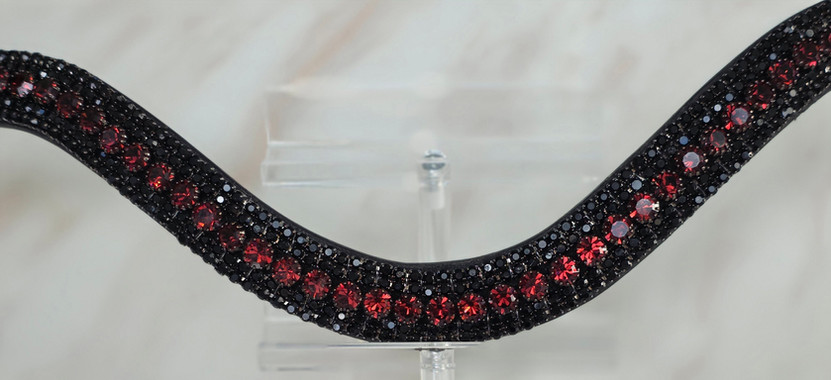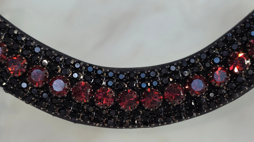 Designed for riders who value quiet authority, precision, and refined elegance, the Cabernet & Caviar browband delivers a competition-ready statement without excess. This jewel-toned piece pairs black diamond sparkle and regal burgundy Preciosa crystals in a striking five-row design, creating depth, brilliance, and balance that elevates the horse’s expression both in motion and at halt.
