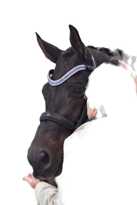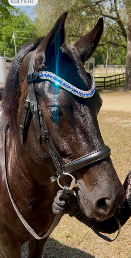 Make a regal statement with the Imperial Sapphire Browband. This luxurious piece is designed with five rows of Preciosa Sapphire and Iridescent Crystals that shimmer with every movement, creating a mesmerizing effect. The larger crystals offer a striking presence, while the contrast against the black leather adds an elegant sophistication. This browband brings together both beauty and strength, making it the ideal choice for riders that appreciate refined, high-class style.