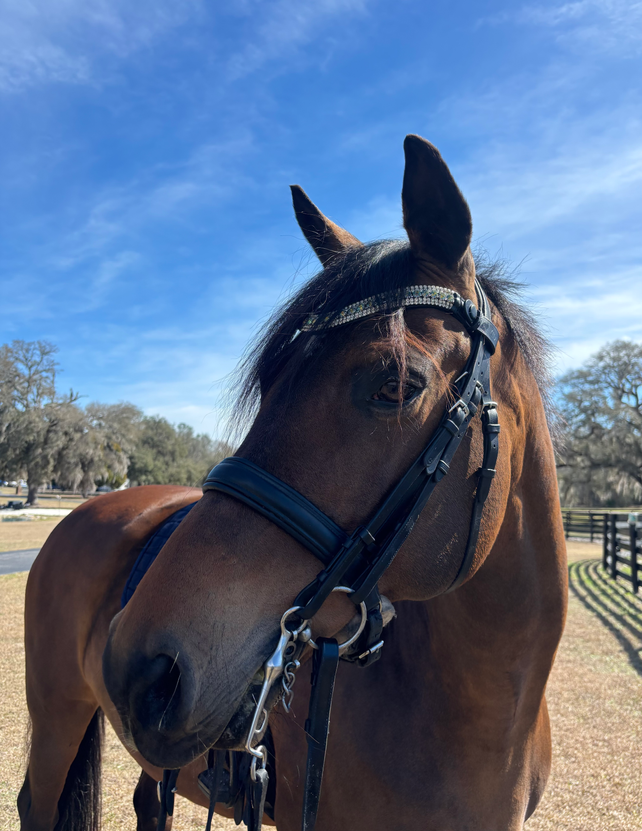 Isle Jewel is the Jewel of the Caribbean with its' magical iridescent blue crystals that reflect and capture the magical alluring variety of blue waters in the Bahamas. Isle Jewel features five rows of larger-scale Preciosa crystals in a genuine black leather browband with convenient button snap button closure to quickly change out your browbands for your favorite Horse Dazzle looks. Back by popular demand.