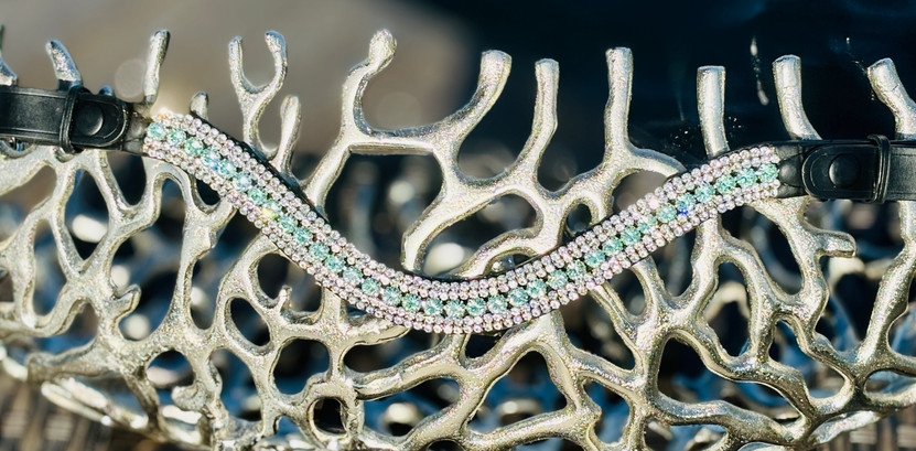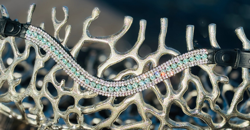 Discover the ultimate blend of elegance and practicality with Mermaid’s Tiara, featuring five rows of larger-scale Preciosa aqua lagoon-colored and clear white crystals in a black leather detachable convenient button closure browband. This exquisite piece not only elevates your horse's style but ensures comfort with its user-friendly design. Pair it perfectly with our Chrystal Lagoon satin and crystal saddle pad for a harmonious, dazzling look. Horse Dazzle is committed to bringing high-quality, modern equestrian style with meticulously crafted products to you. Experience the unparalleled charm and sophistication that Mermaid’s Tiara adds to your equestrian ensemble. Chrystal Lagoon Saddle Pad sold separately. Horse Size: Full 42 CM/16.5"