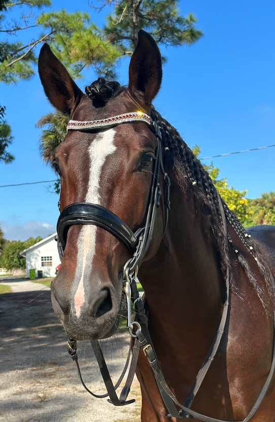 This luxurious accessory features a stunning five row arrangement of large deep, rich ruby-colored Preciosa crystals paired with sparkling, brilliant diamond like crystals, creating a dazzling effect that catches the light from every angle. Convenient button snap closure black genuine leather browband.
